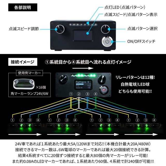 0.08AのLEDマーカーであれば1系統あたり60個、4系統で240個が可能!!
