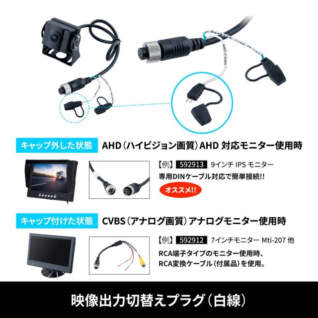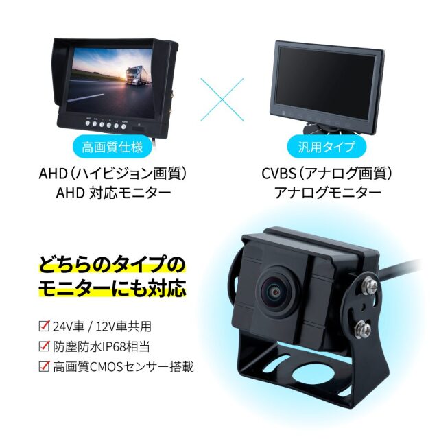 ご利用になるモニターが高画質なAHD、または一般的なアナログ(CVBS)タイプのモニター双方に対応する2WAYカメラ。